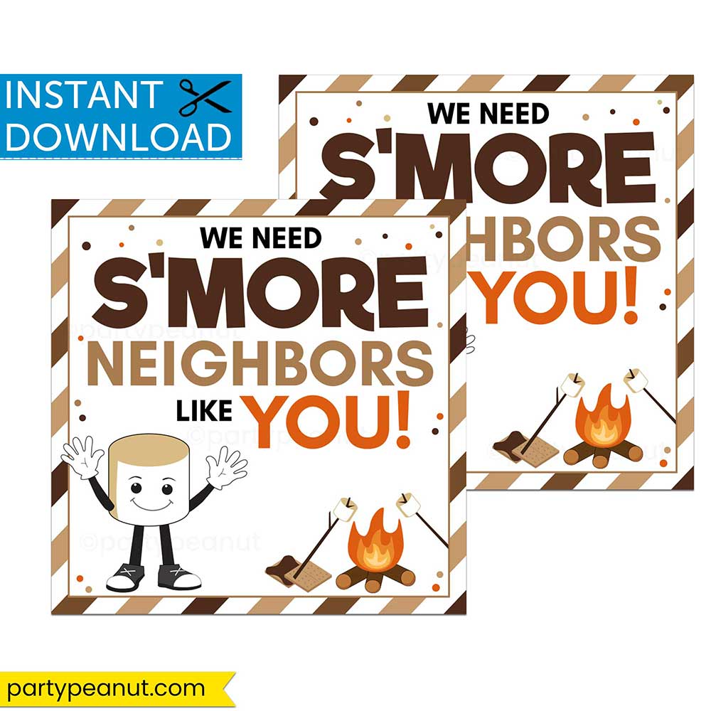 Printable gift tags, “We Need S’MORE Neighbors Like You!” are perfect for Smores gifts for neighbors. They look great on neighbor appreciation gifts.