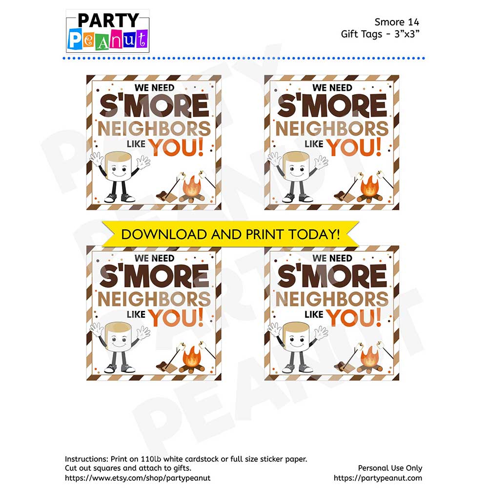 Easy to use. Simply attach tags to a cello bag that has a graham cracker, chocolate, and a marshmallow in it. For example, these brown and white gift tags can be used as stickers, labels, favor tags, or thank you tags on smore gifts and smore’s kits for neighbor gifts.